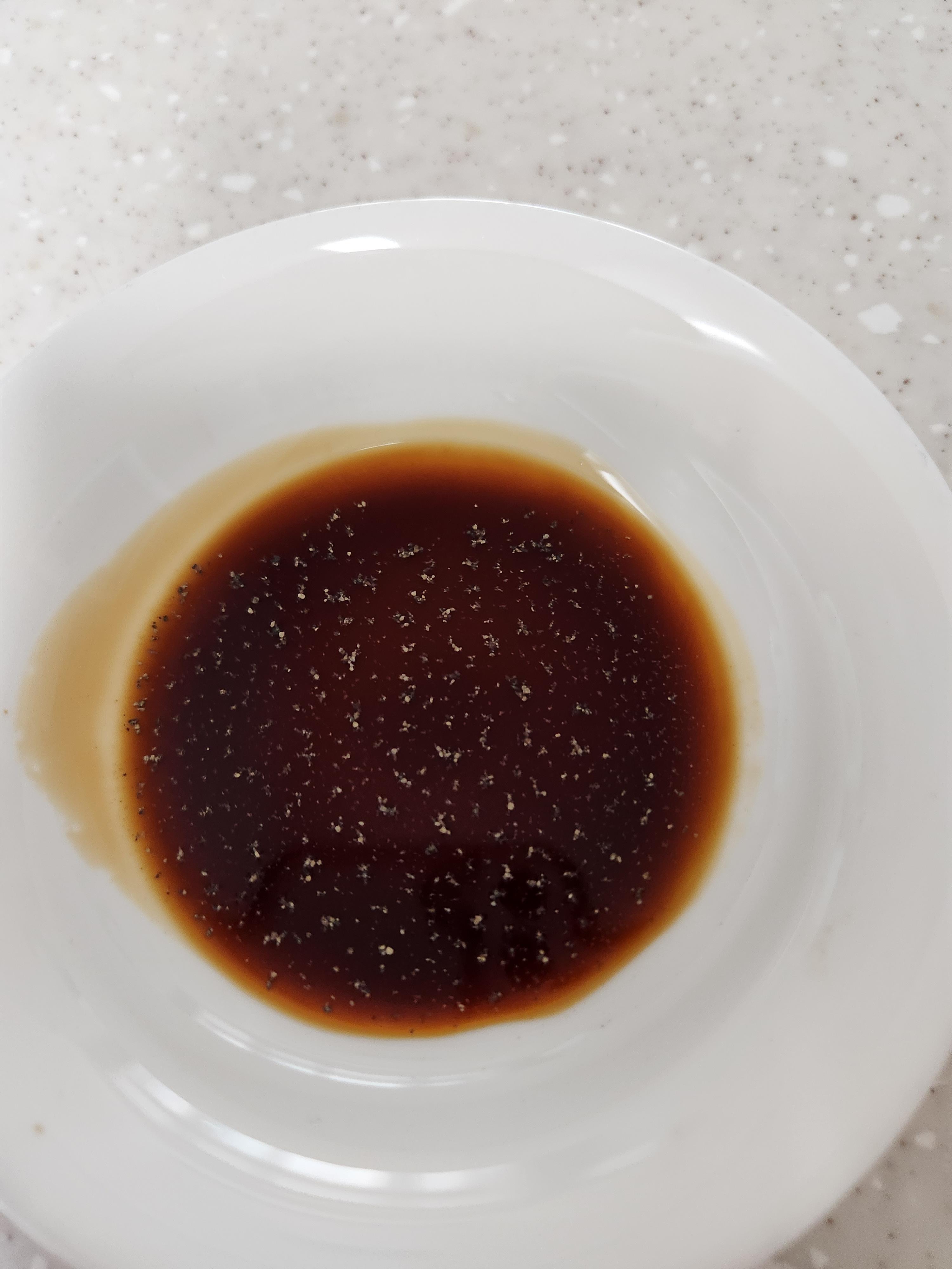 군만두나 찐만두나 물만두 먹을 때 간장을 찍어먹어야 더 맛이 있지요. 간장종지에 간장을 조금 담고요. 물을 1/2~1티스푼 넣어줍니다. 그리고 후추만 조금 뿌려주면 됩니다.