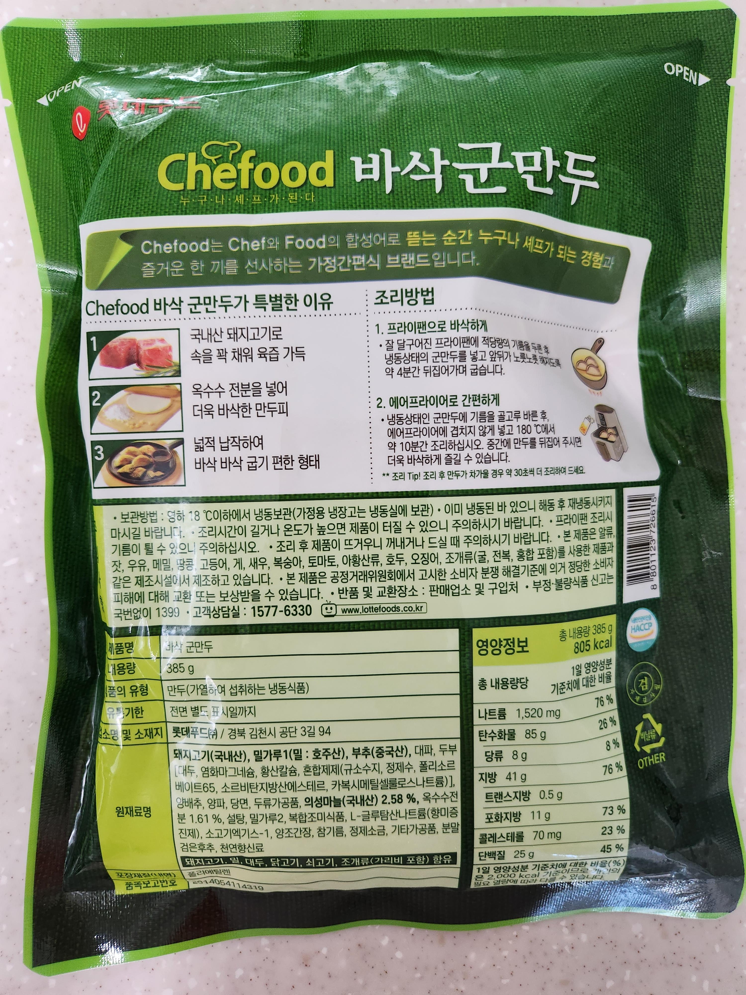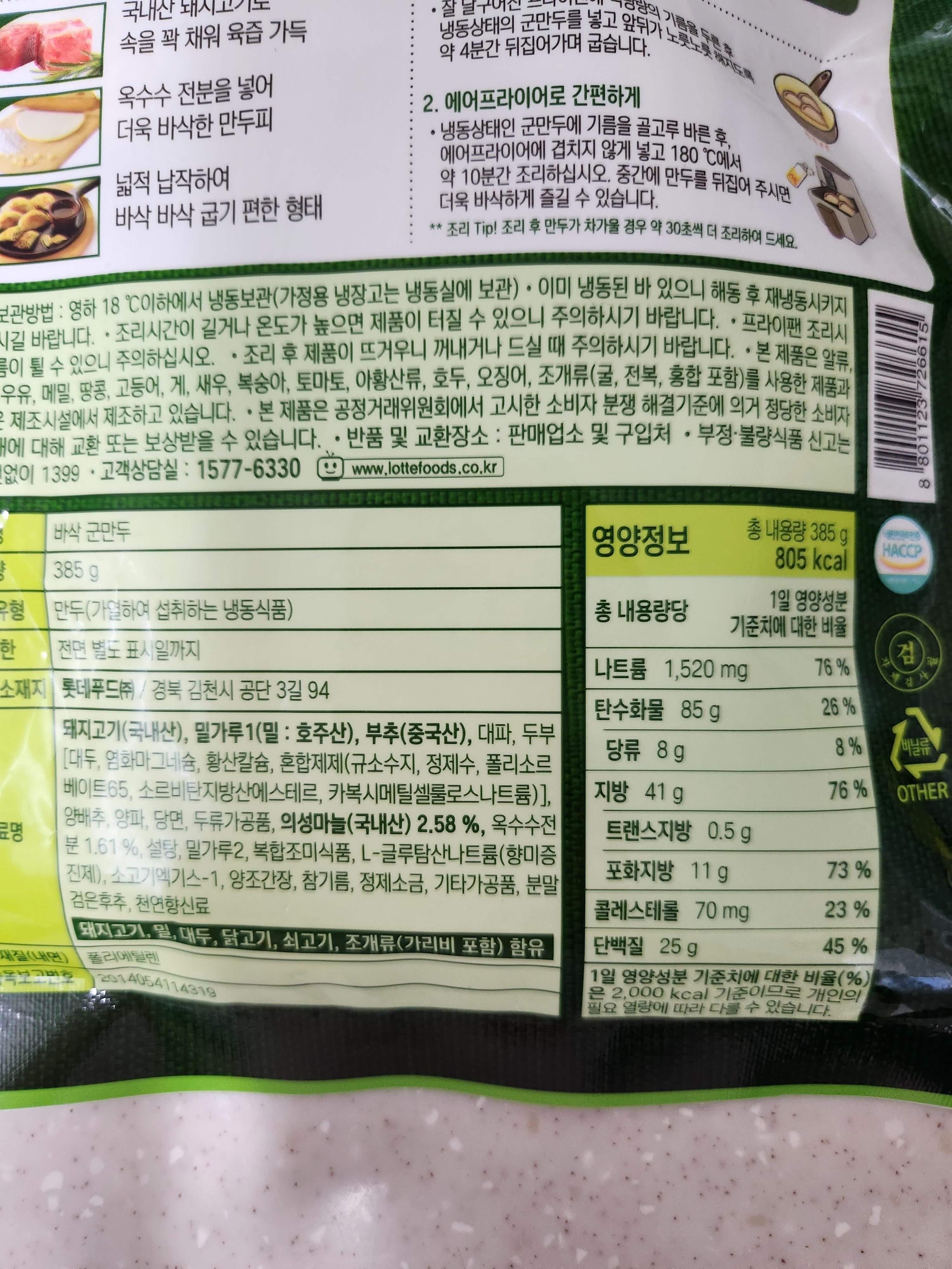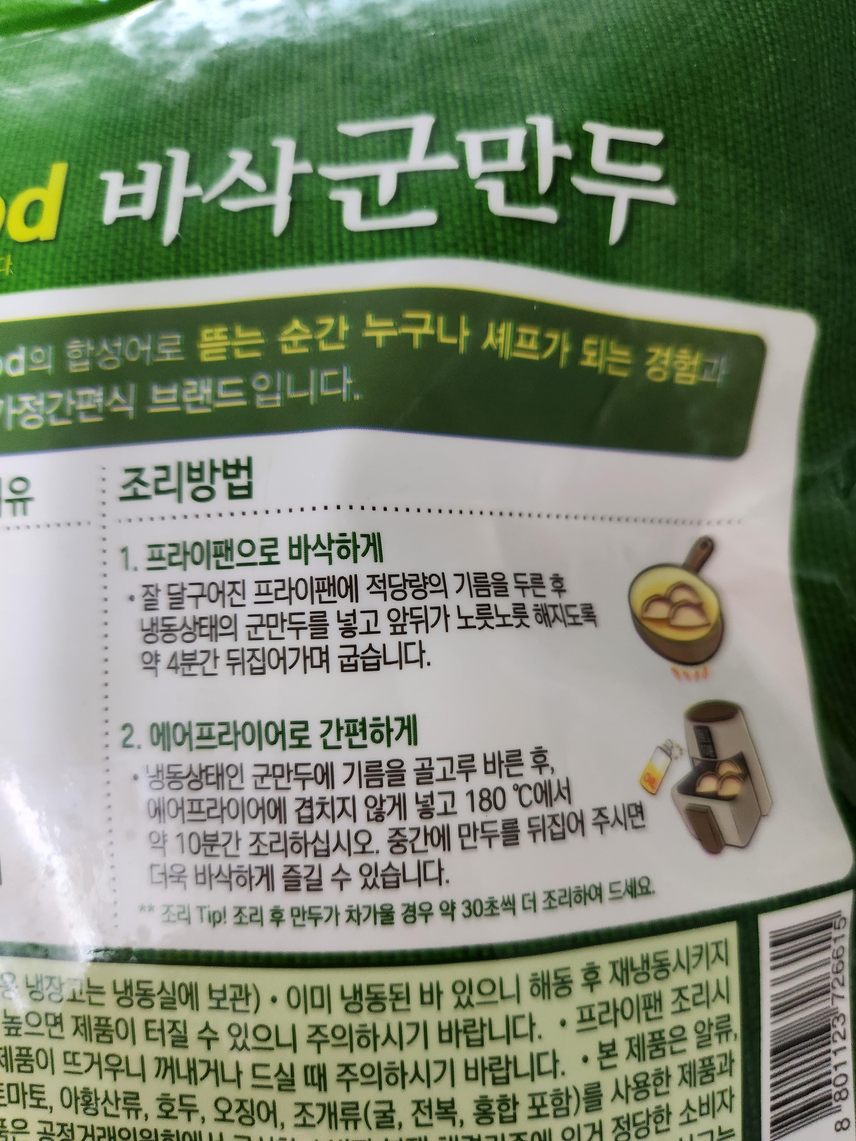 냉동만두 포장지에 프라이팬에 조리하는 방법과 에어프라이어로 조리하는 방법이 나와있습니다.