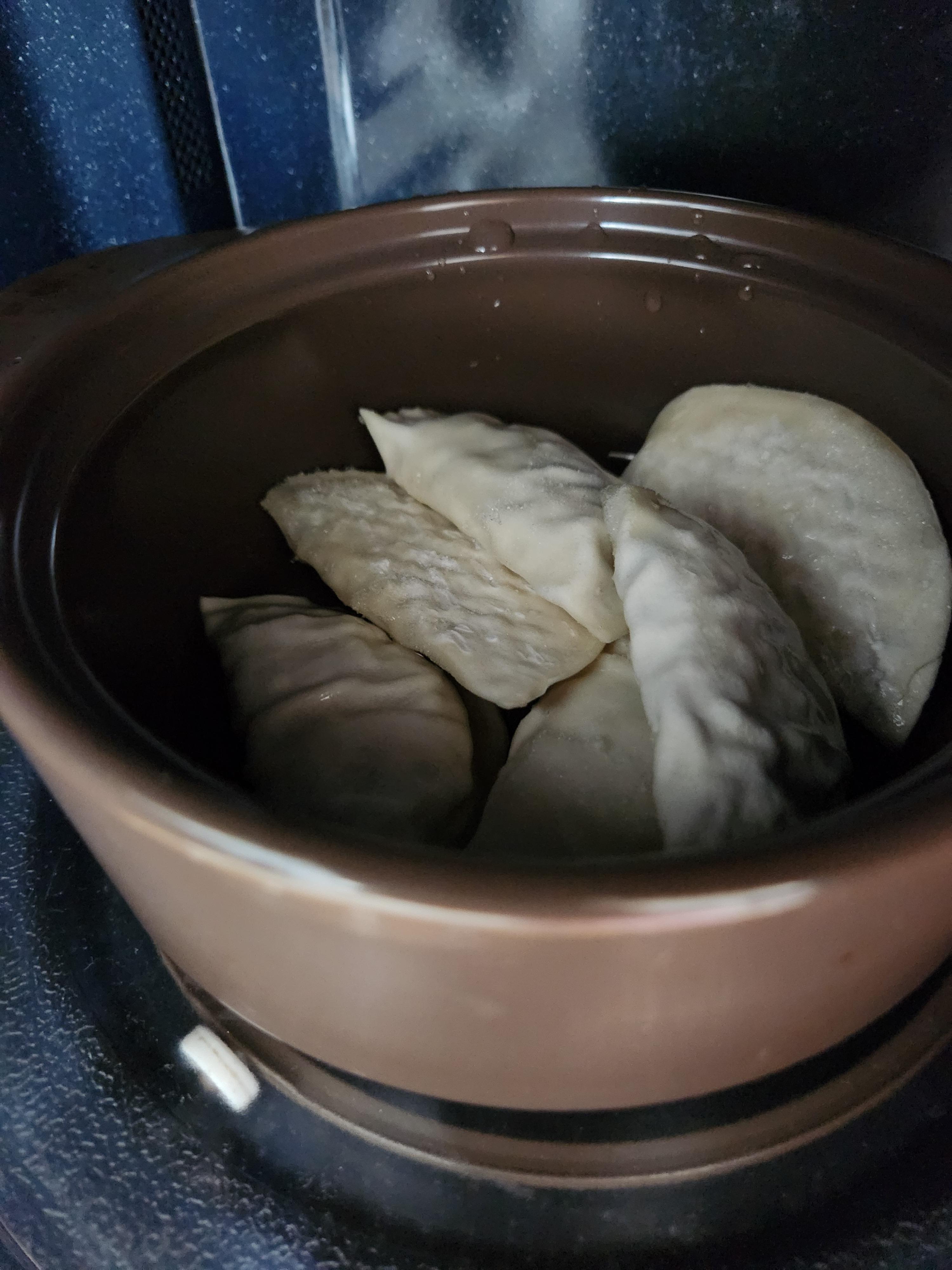 집 냉동실에 있는 만두를 그릇에 담아 물만 조금 넣어 전자레인지에 넣어 돌리기만하면