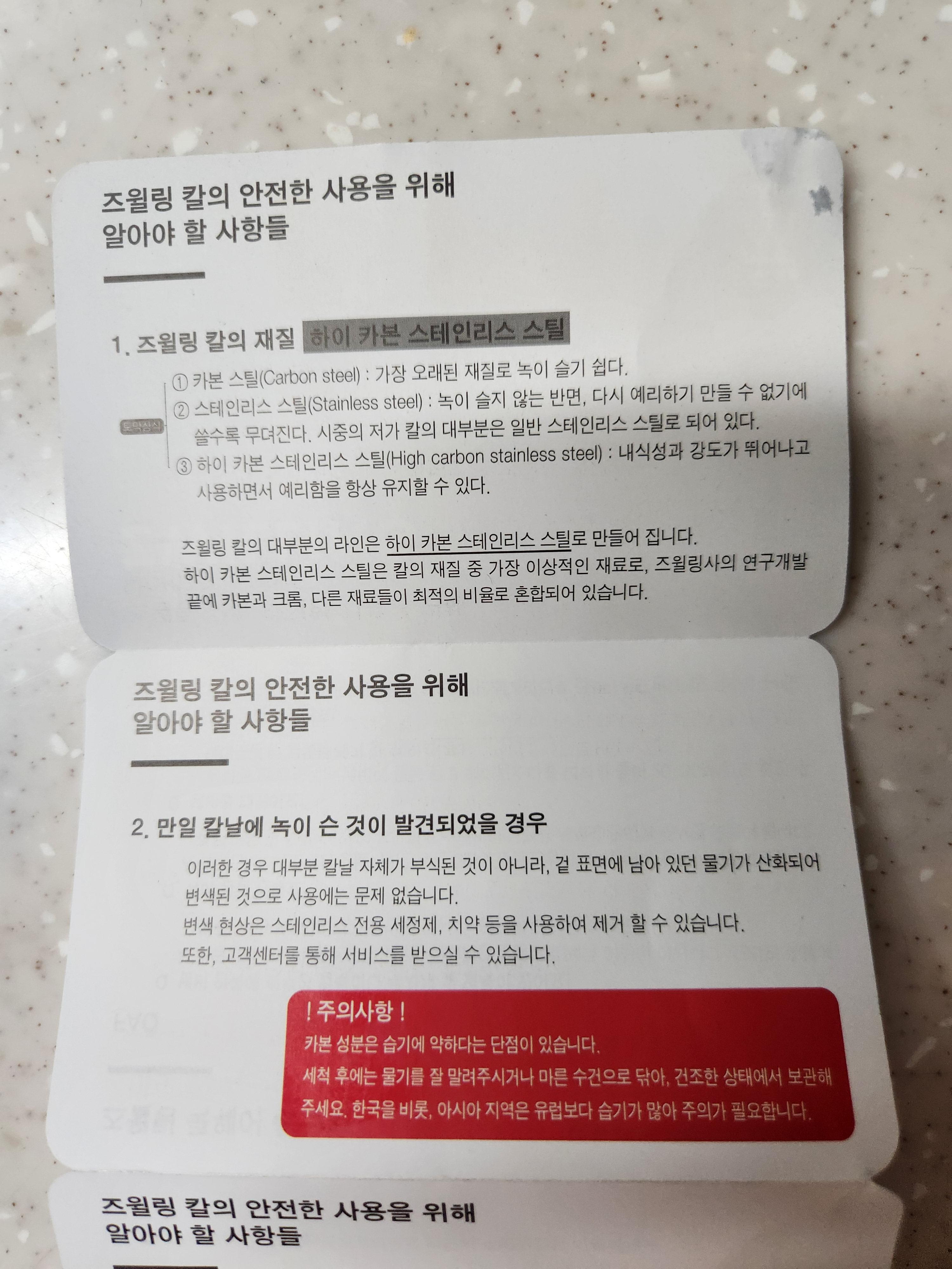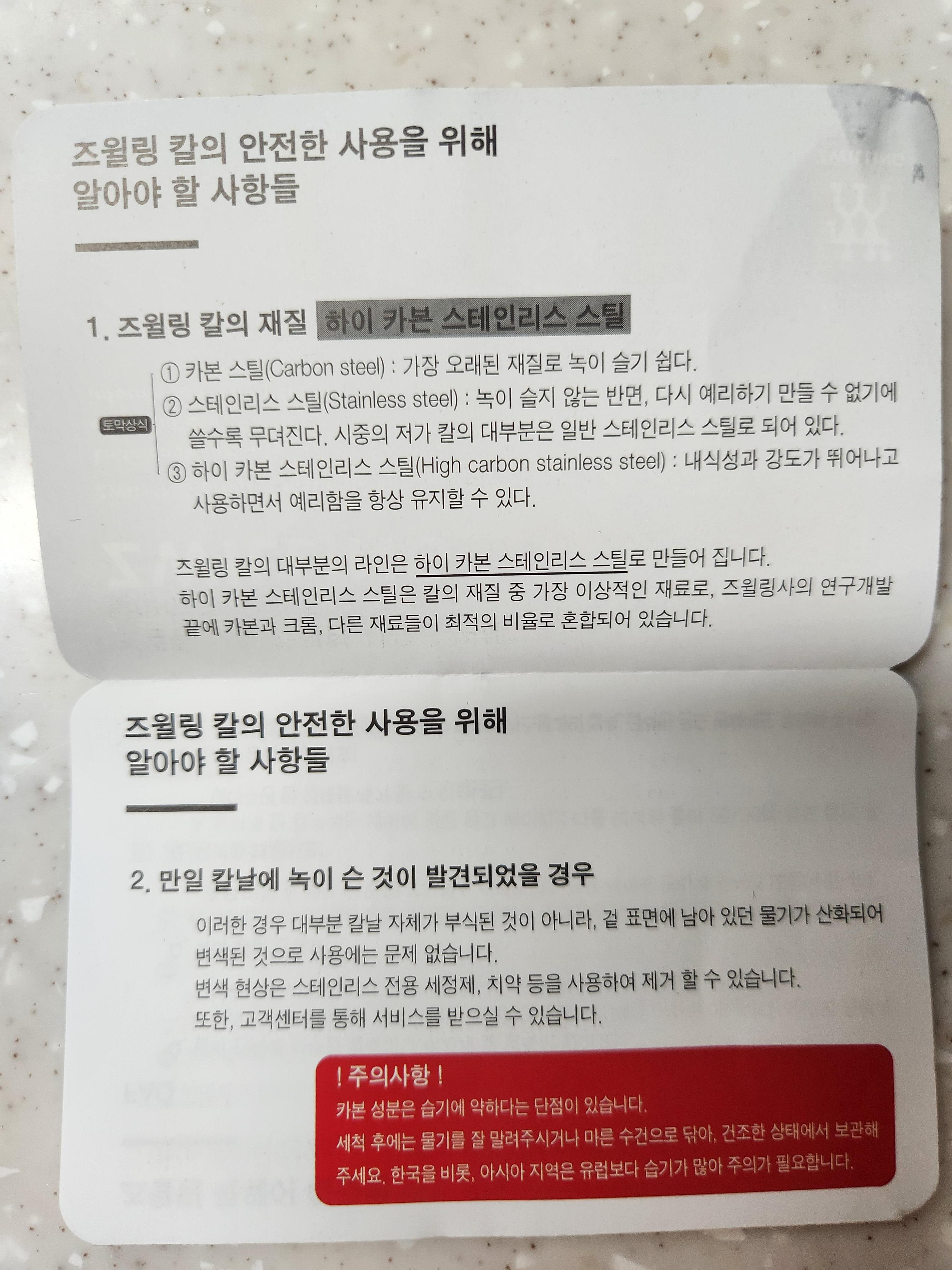 칼날에 녹이 슨 것이 발견되었을 경우엔 겉 표면에 남아있던 물기가 산화되어 변색된 것이므로 스테인레스 전용 세정제, 치약 등으로 제거할 수 있다는 정보를 알 수 있었습니다.