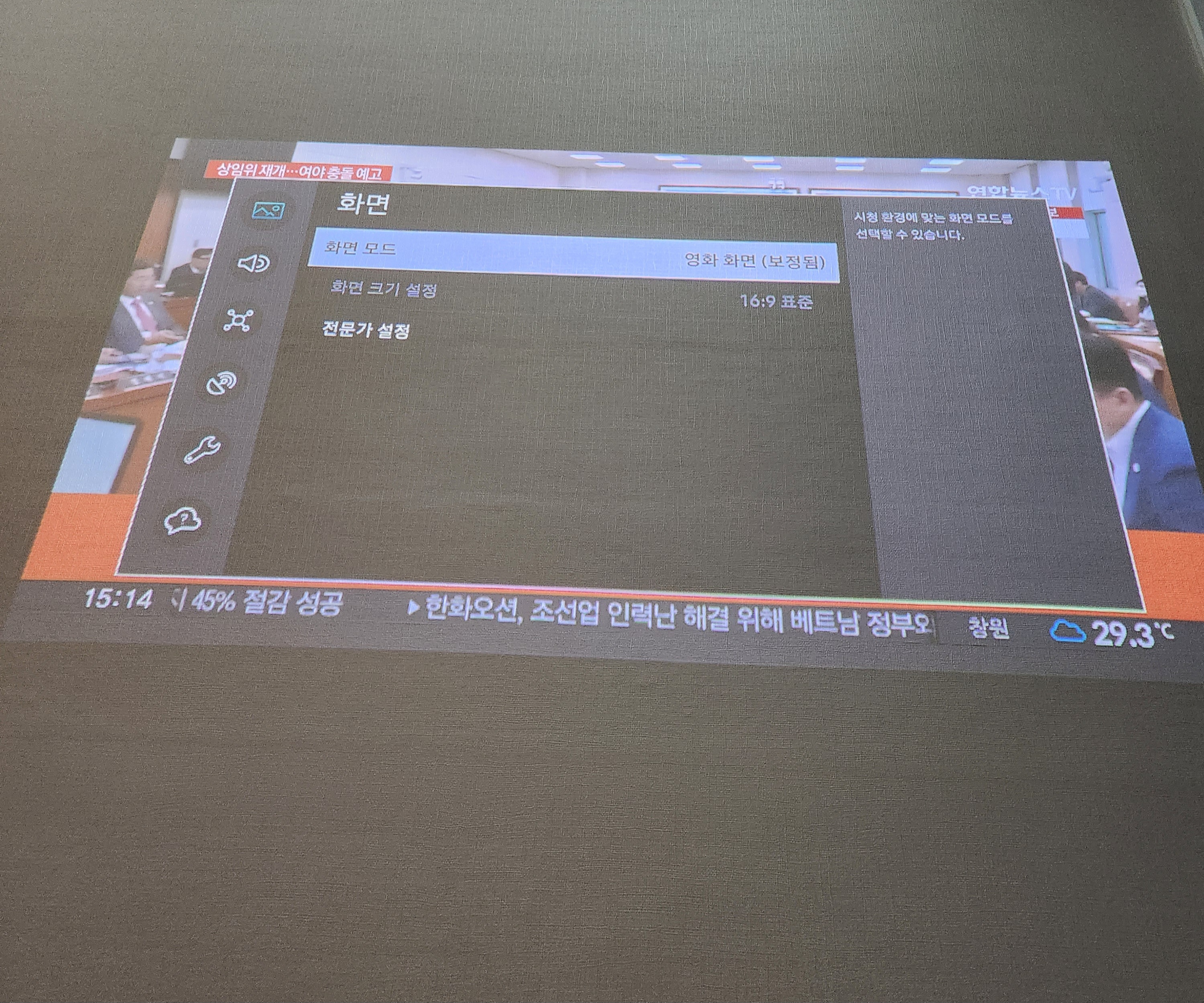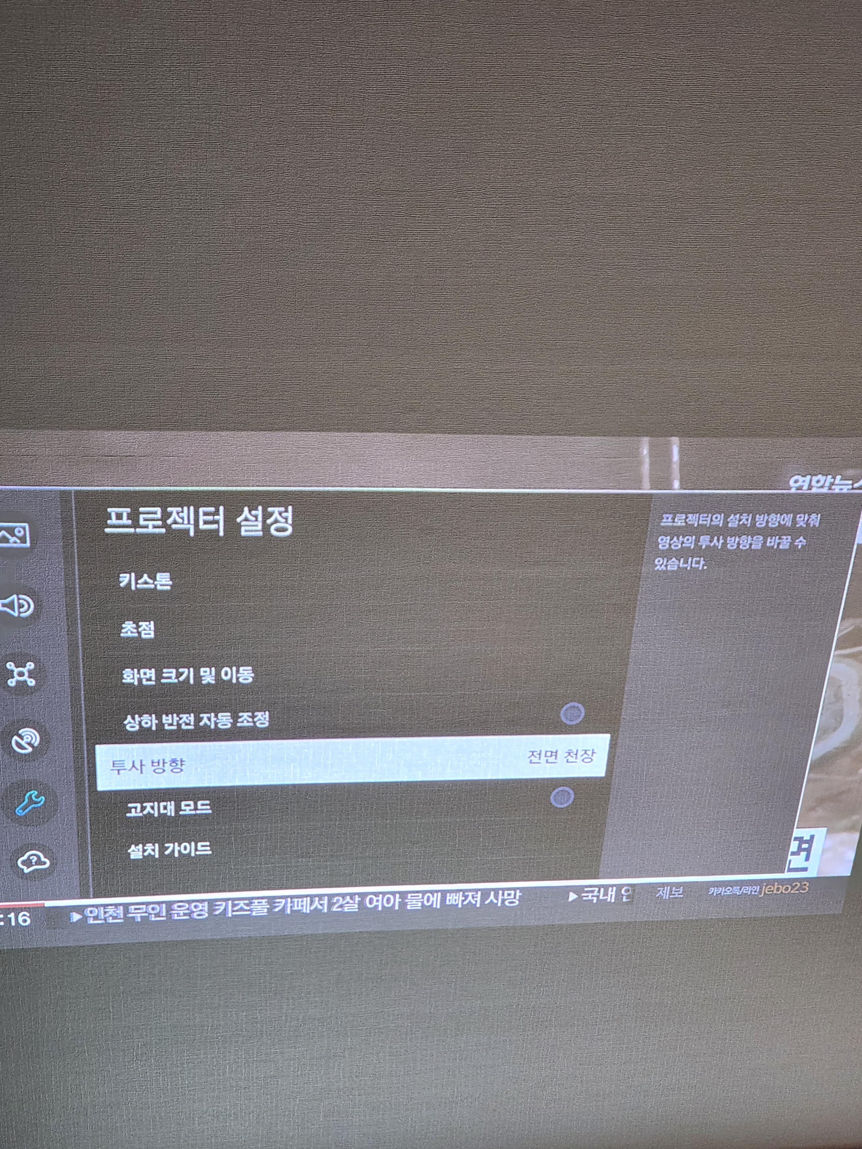키스톤은 자동조절이 되는데 이게 앞서 언급한 것과 같이 먼지 쌓이면 나중에 제대로 안되기 때문에 수동으로 설정해두고 쓰고 있습니다. cpu가 후달리는지 앱 실행시 딜레이 있습니다. 그리고 쿠팡플레이 볼때 가끔 영화 중간에 중지되기도 합니다만, 막 짜증이나고 그런 정도는 아닙니다. 왜냐하면 그냥 멍하니 보는 용도이므로 전환이나 조작이 많지 않아 참을 만한 수준입니다.