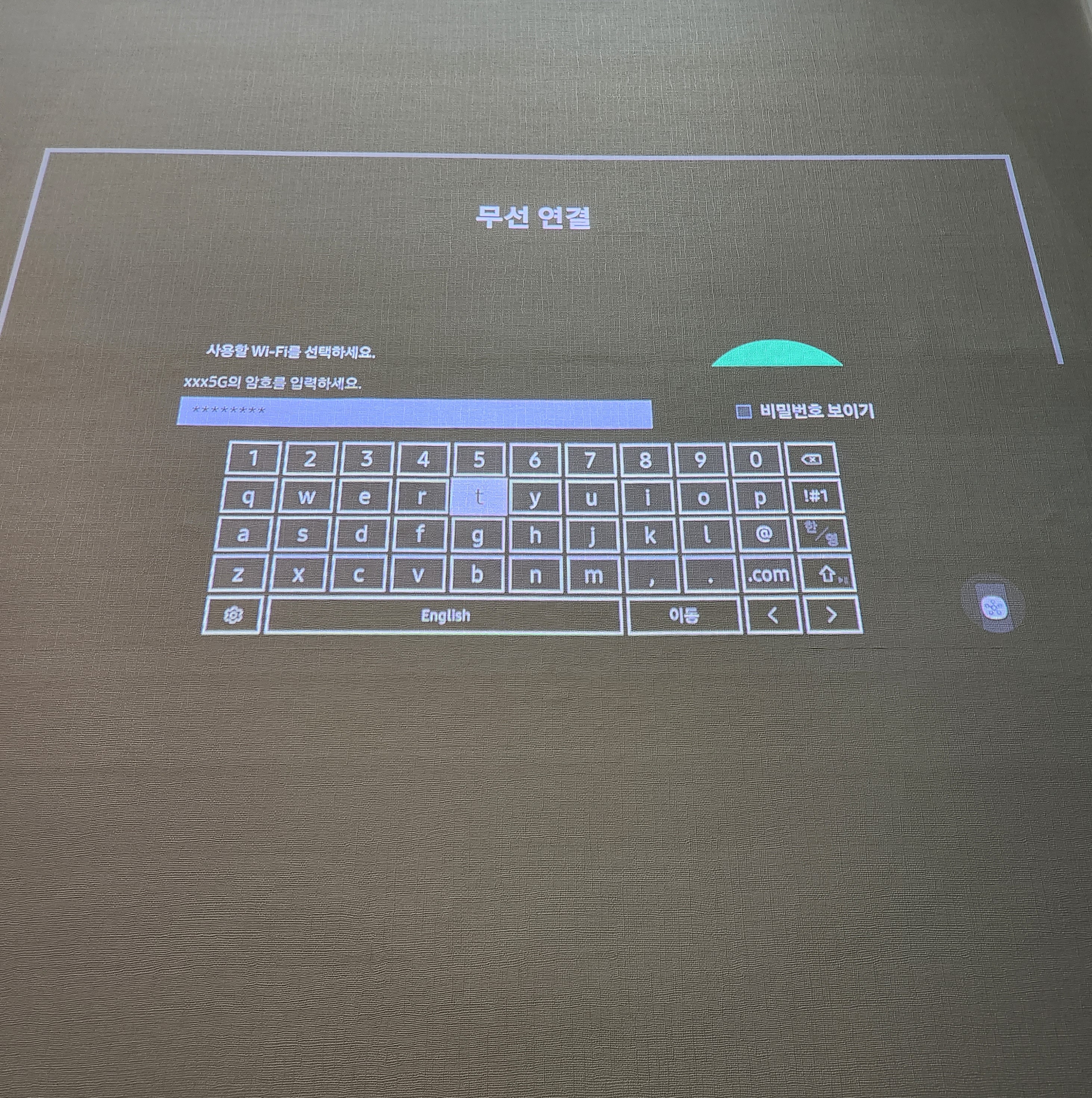 천장 벽지(굴곡이 있는 벽지 입니다)에 바로 쏜 모습입니다. 화질이 구립니다. 우선 벽지가 문제입니다만 6개월 동안 그냥 쓰고 있습니다. 그냥 대충 보는 용도이기 때문에 고화질을 기대한 게 아니라 조금 편한 자세로 영상 조금 보자는 용도이기에 그냥 쓰고 있네요. 리모컨은 방향을 바꾸면 커서가 움직이는 그런 고급기능은 없고 그냥 눌러서 뭔가를 다 입력해야합니다. 하지만 리모컨이 개인적으로 마음에 듭니다. 키감이나 마감 등