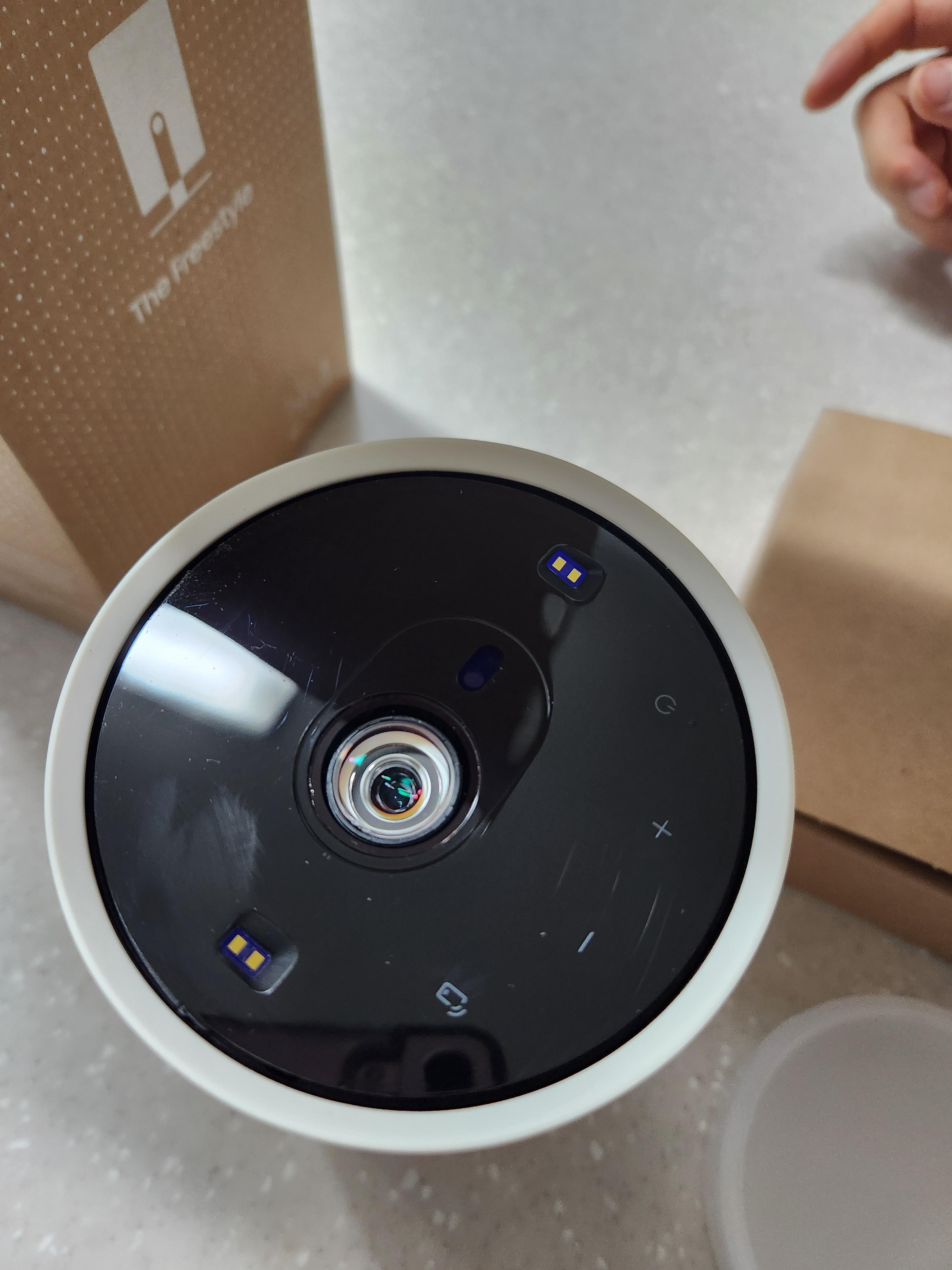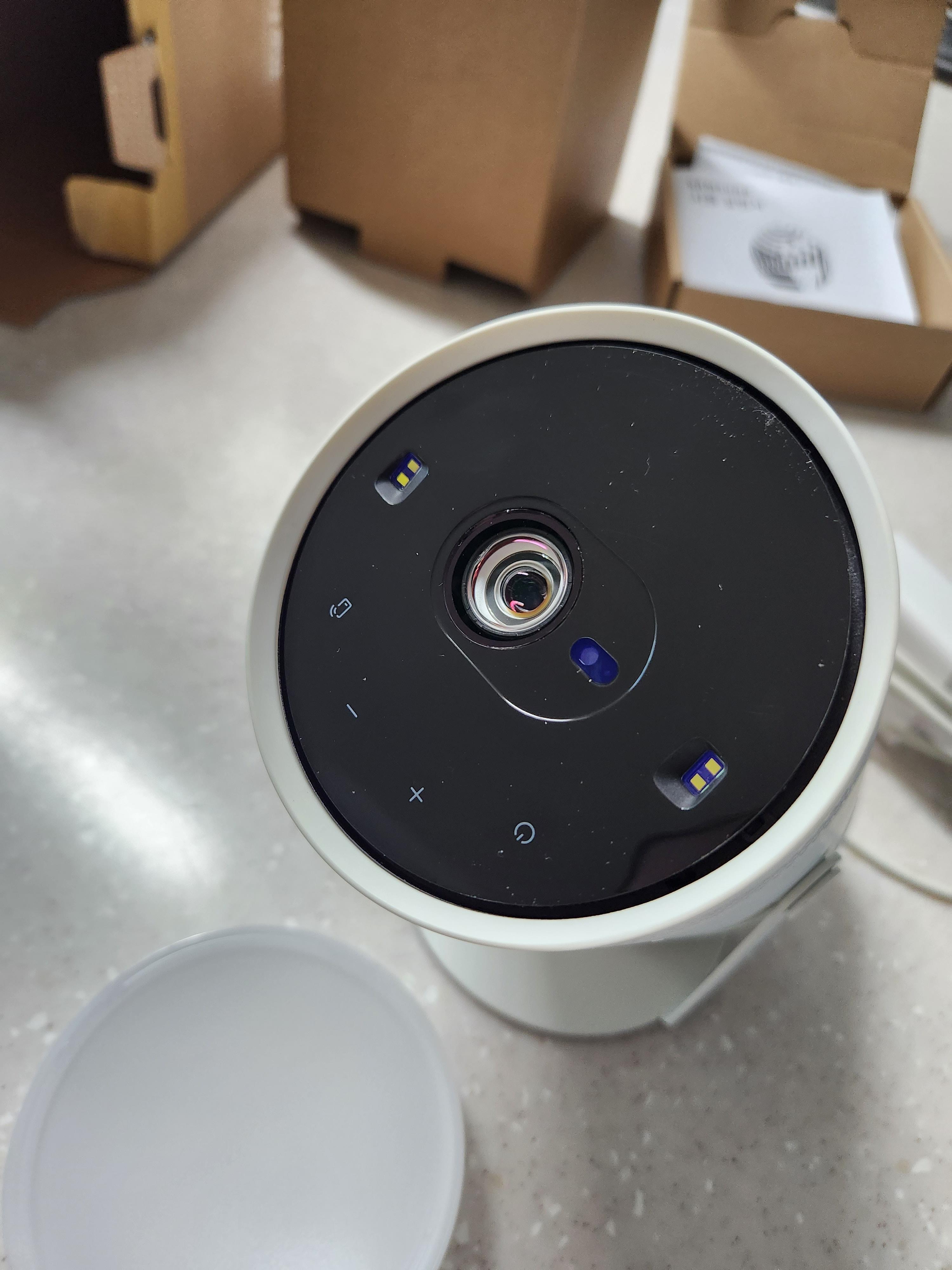 상단 모습입니다. 터치패드가 있는데 쓸 일 거의 없는 것 같습니다. 다 리모컨으로 제어합니다. 양쪽에 점2개씩 총 4개가 있는데 정확히 어떤 용도인지는 모르겠네요. 레이저를 쏴서 돌아오는 걸 감지하는 것인지 모르겠습니다... 천장을 향해놓다보니 먼지가 많이 쌓이는 단점이 있는데, 천장 쏘면 렌즈가 먼지 앉는 방향이니 어쩔 수 없는 것 같습니다. 키스톤이 자동이 안되는 경우가 간간히 발생하는데, 먼지 때문인 것 같습니다. 그래서 그냥 수동으로 설정해서 쓰고 있습니다.