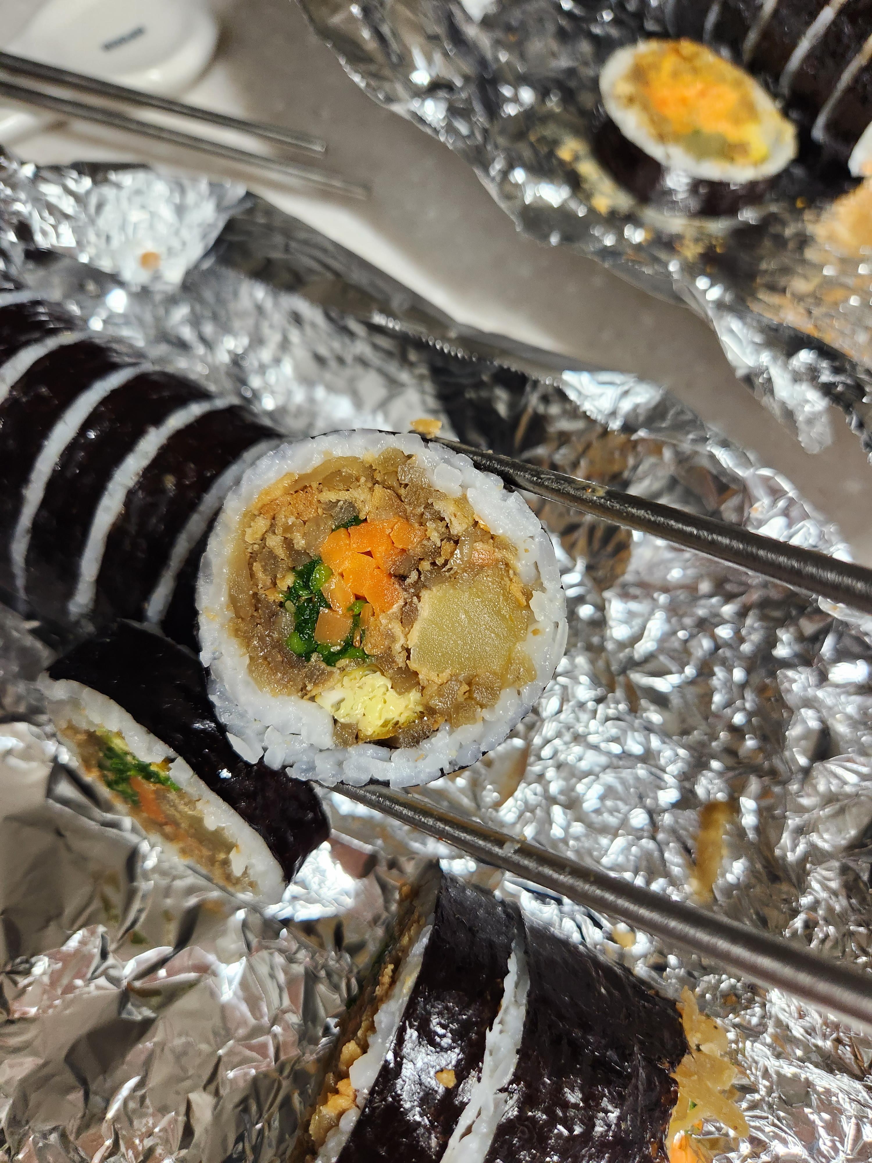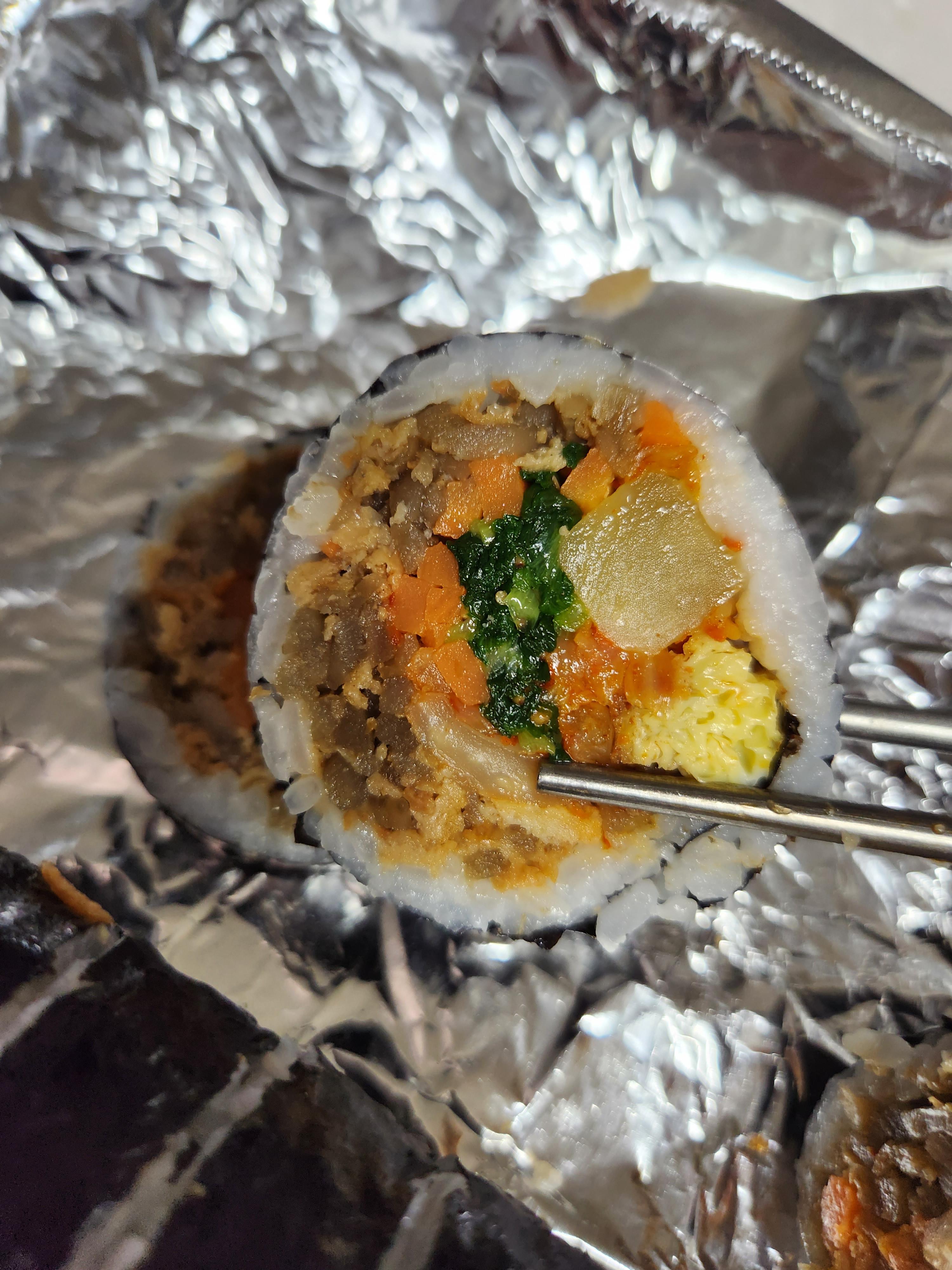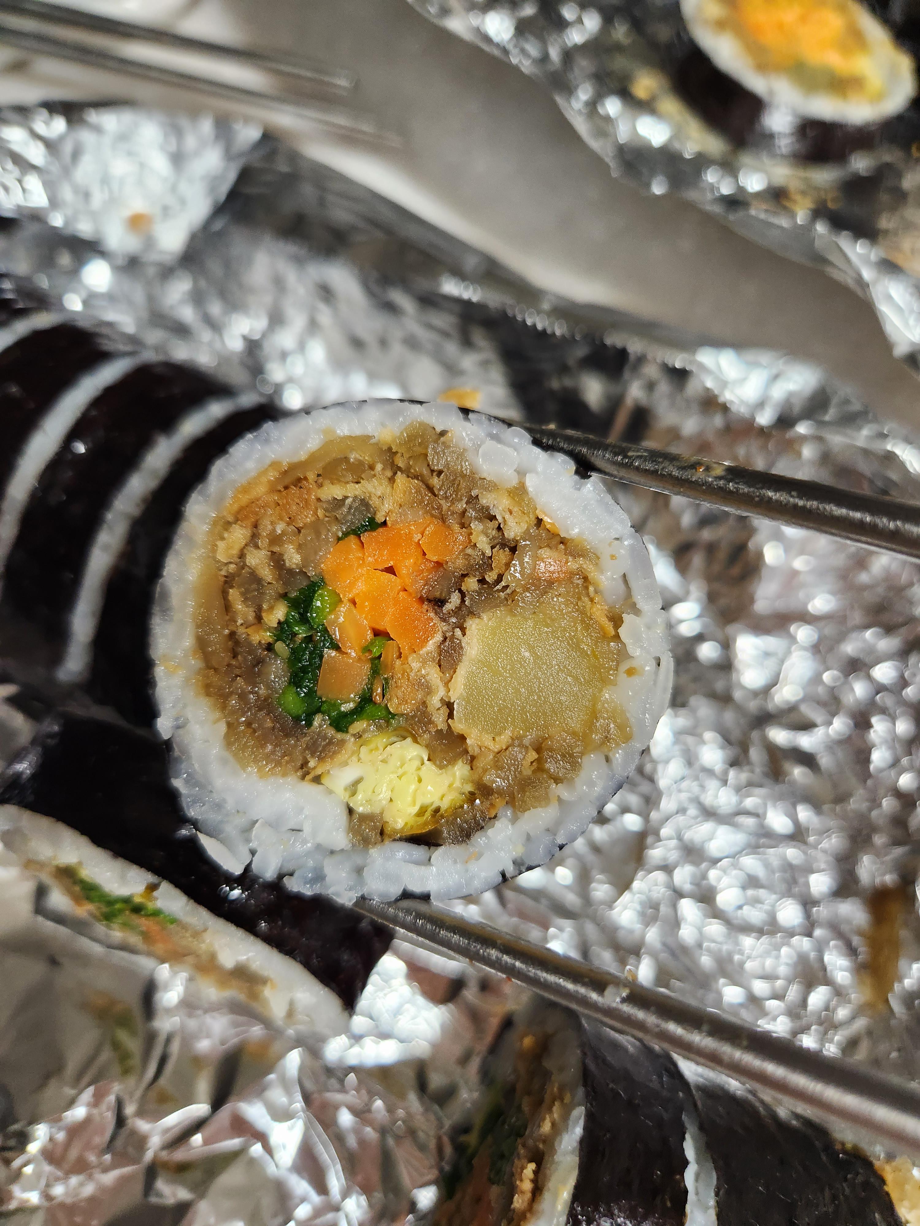 두툼하게 만들어진 김밥입니다. 이건 김치유부김밥이에요.