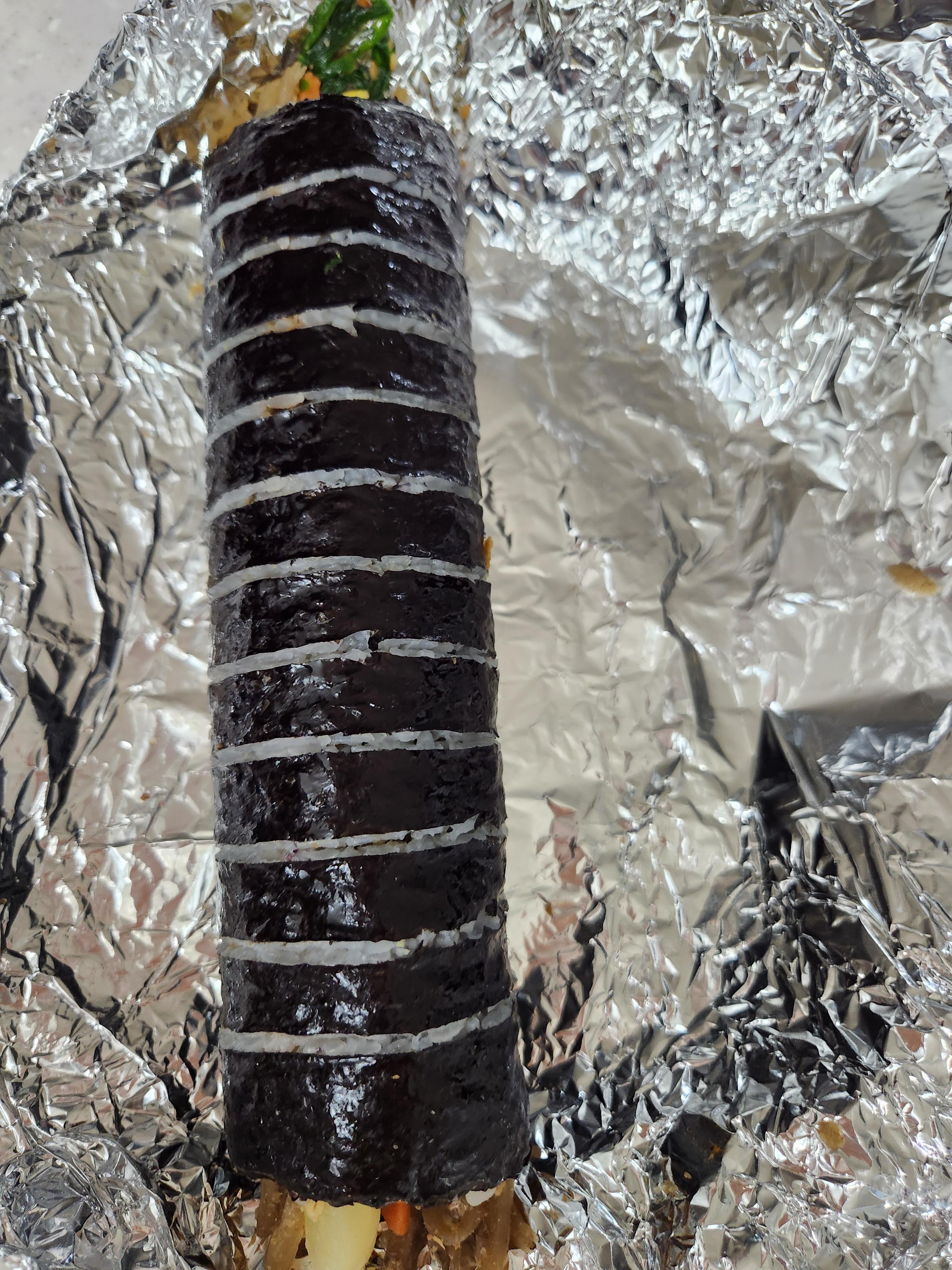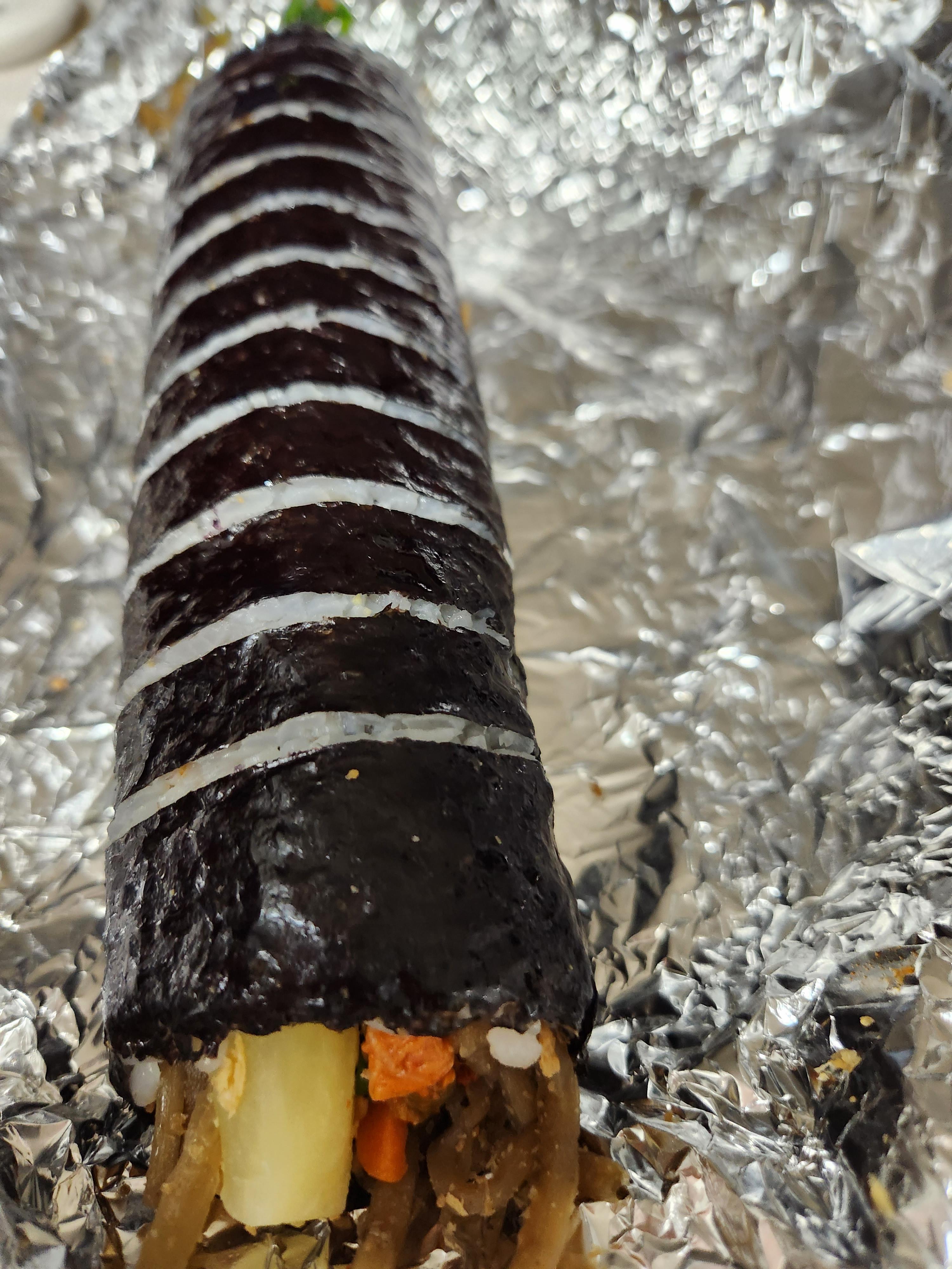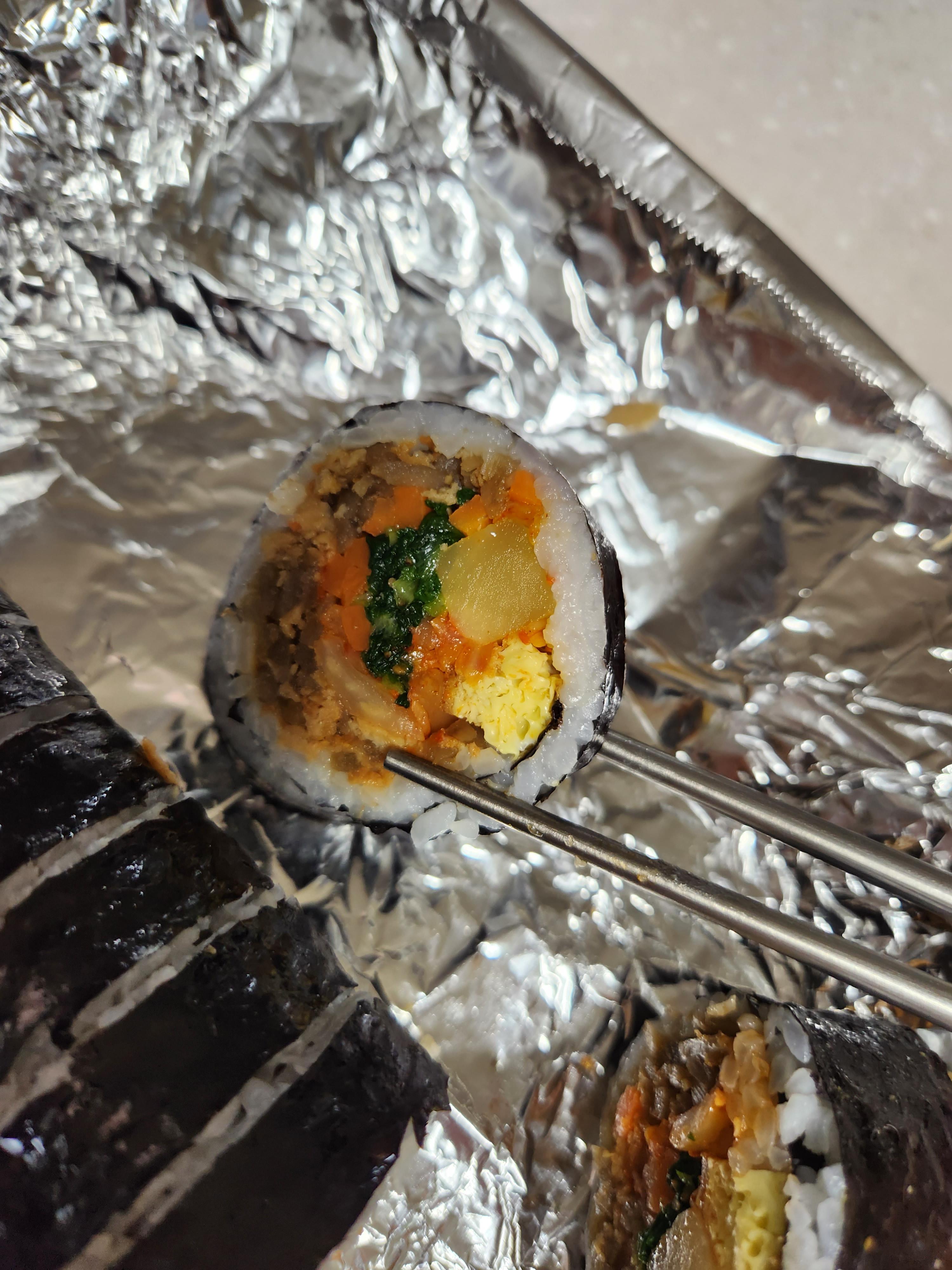 두툼하게 만들어진 김밥입니다. 이건 김치유부김밥이에요.