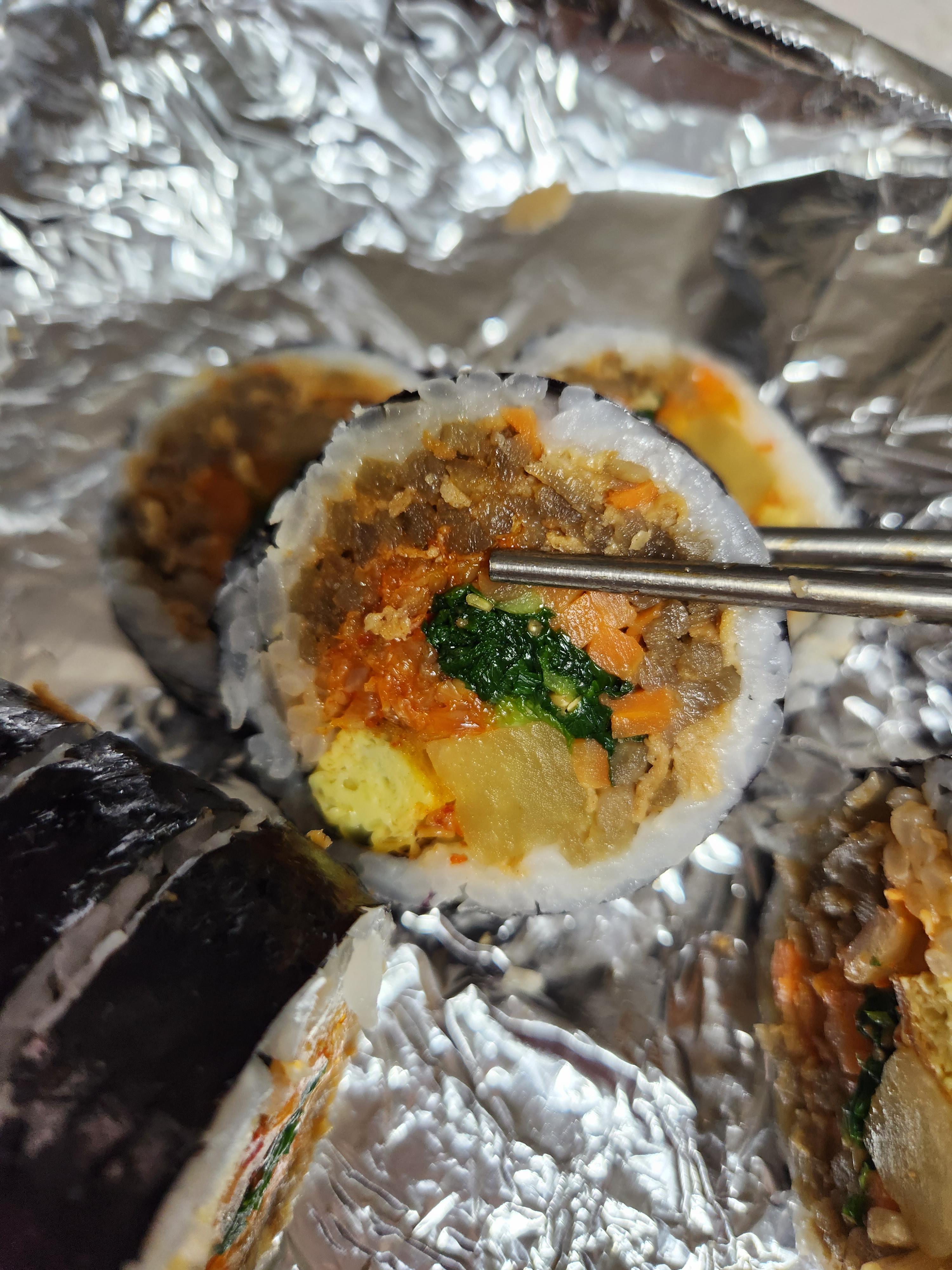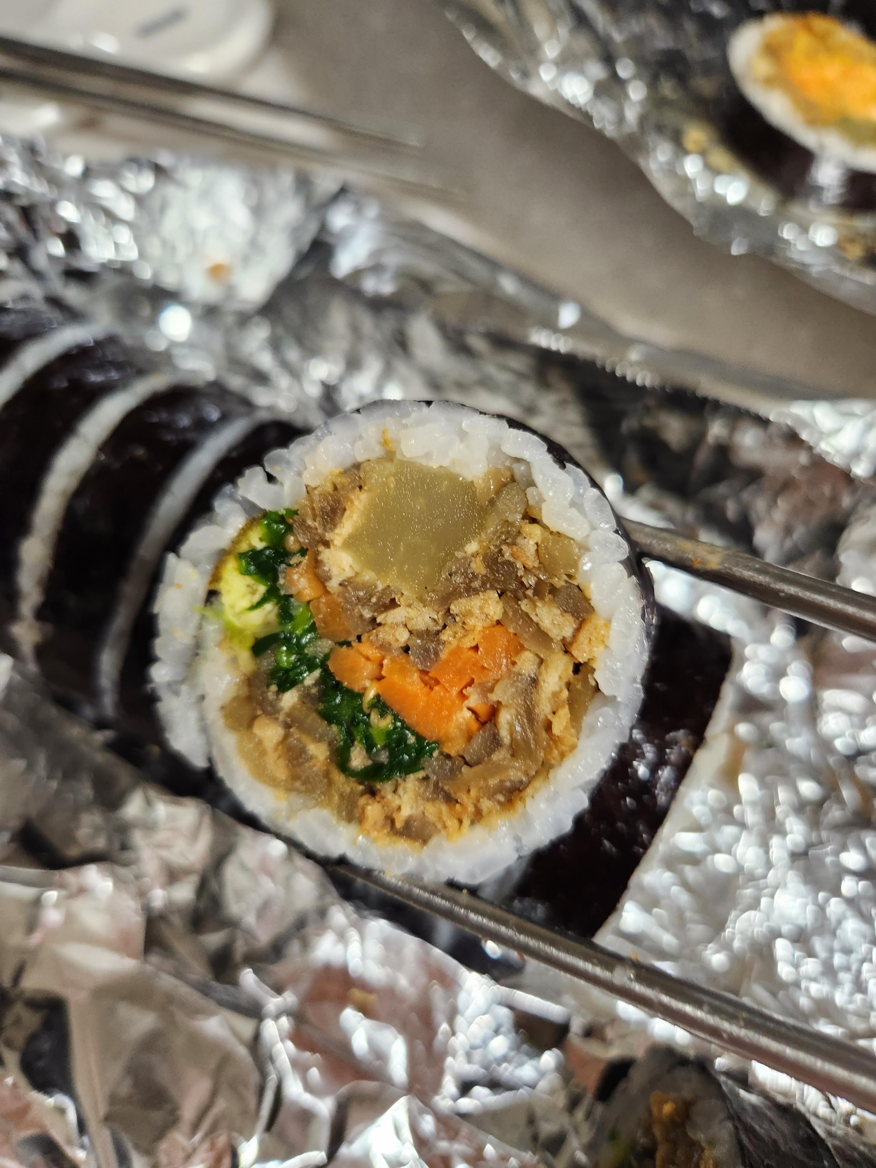 유부가 기본으로 들어가고 김치, 단무지, 계란, 시금치 당근 우엉 등이 들어가있고요.