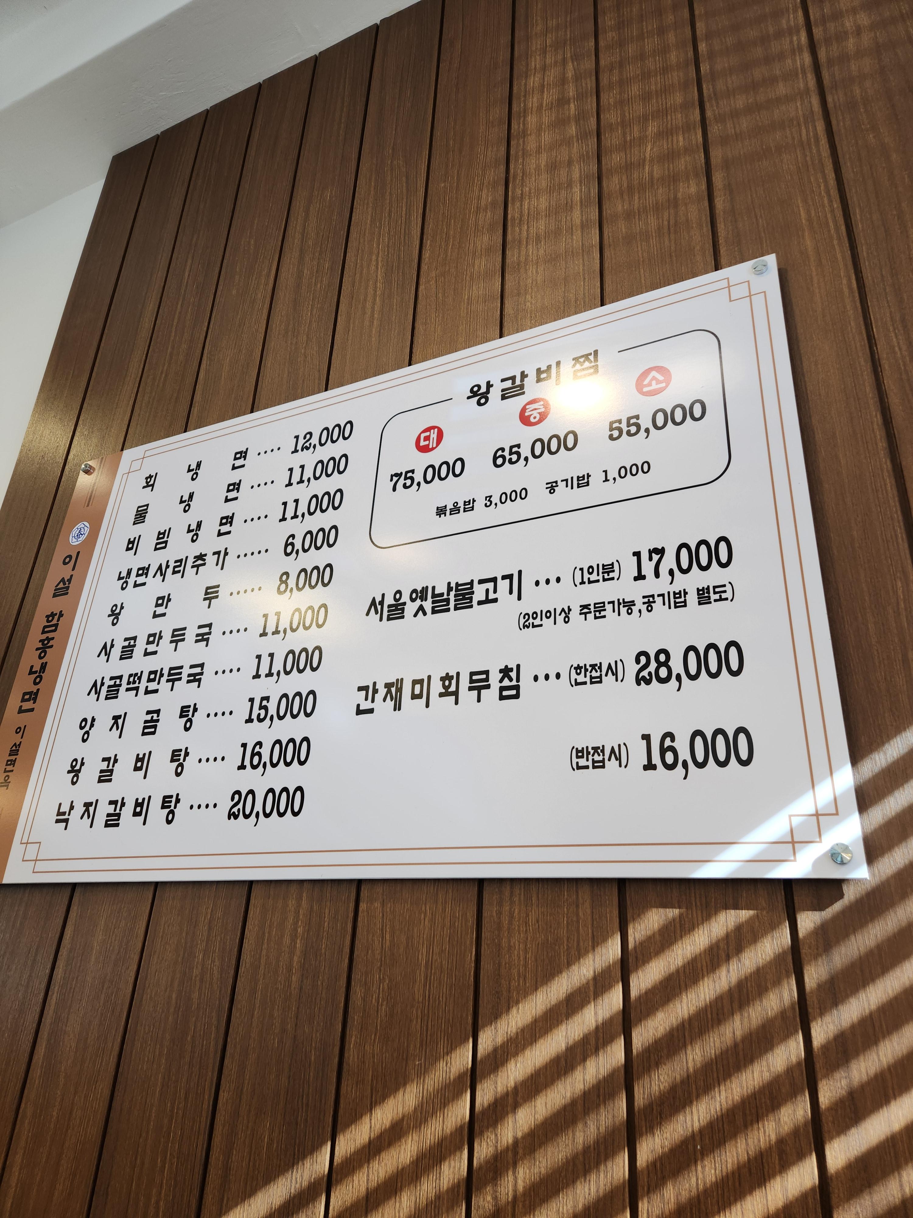 회냉면, 물냉면, 왕만두, 만두국, 떡만두국, 양지곰탕, 갈비찜, 불고기, 간재미회무침을