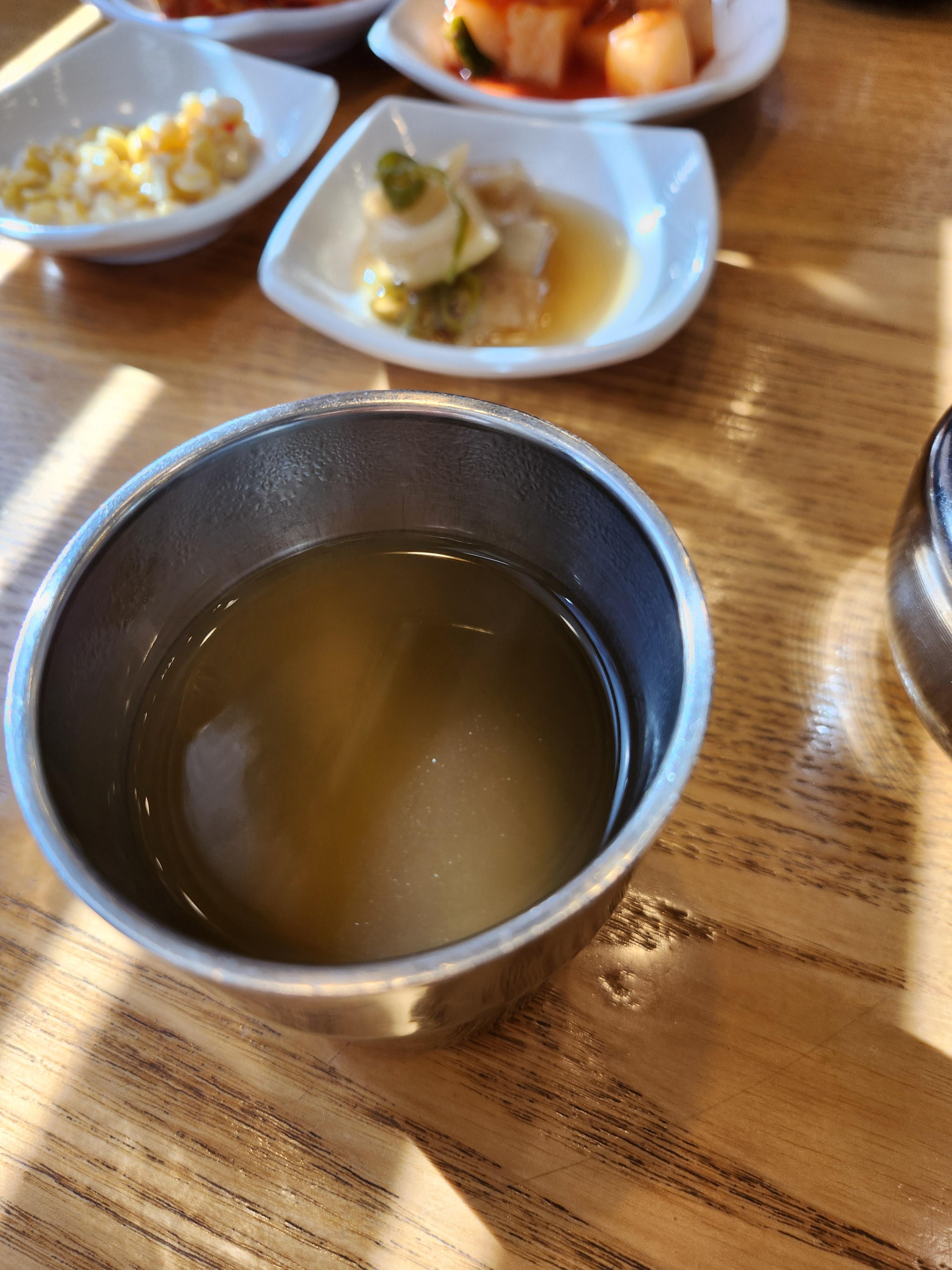 음식을 주문하니 따뜻한 육수를 주시더라고요.